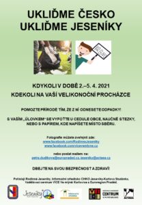 Během velikonočních svátků 2. – 5. dubna 2021 proběhl první ročník akce „Ukliďme Česko – Ukliďme Jeseníky“. Výzva k akci se uskutečnila prostřednictvím on-line prostředím. I přes nepříznivé počasí a pandemická opatření zavítalo do přírody podle zpětné odezvy mnozí lidé, jimž záleží na přírodě a pomohli jí tak od různorodých odpadků. Ze zpětných reakcí jsme se dozvěděli zhruba o 50 zúčastněných na 14 místech našich jesenikcých hor i jeho podhůří.