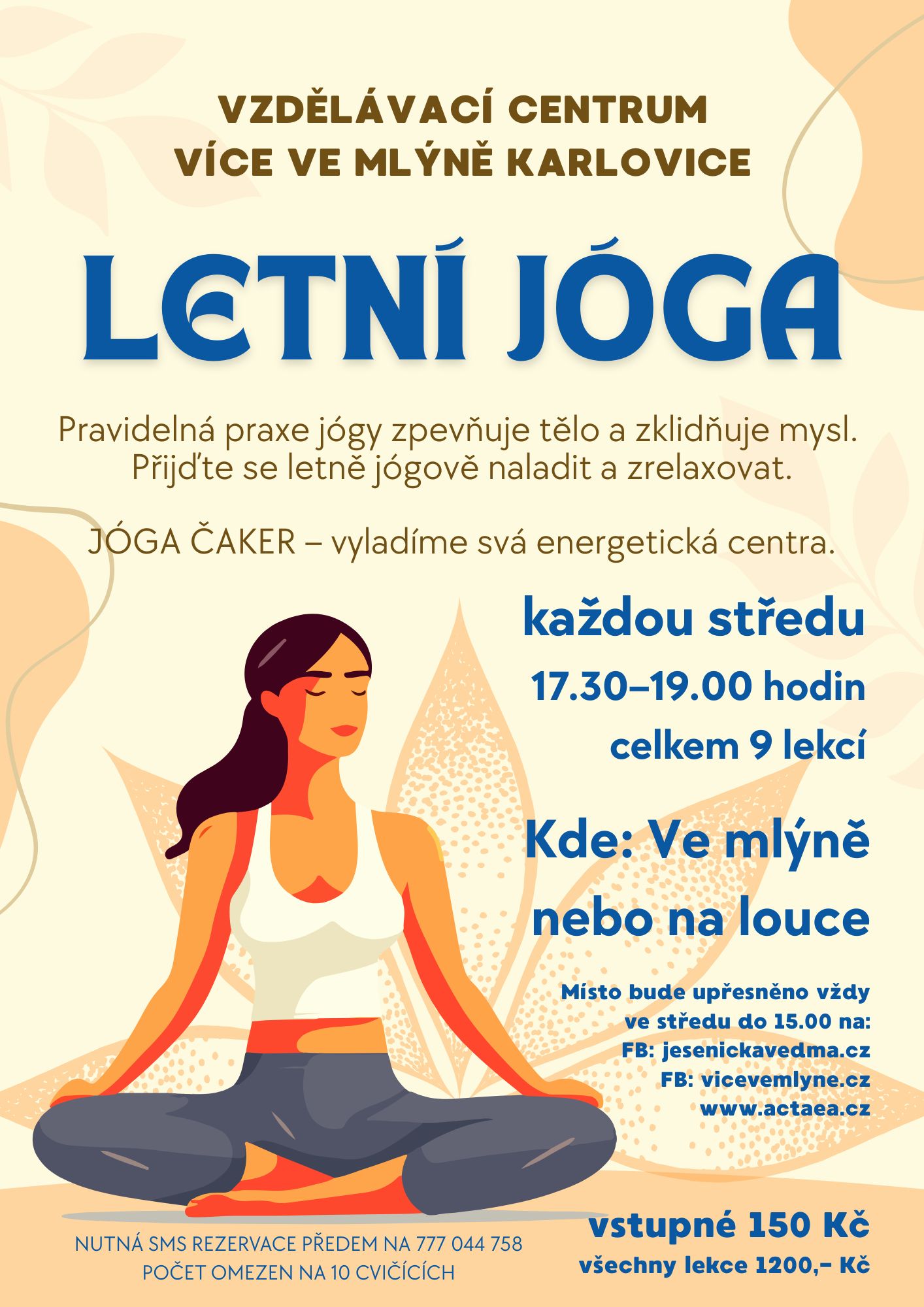 Čeká vás celkem 9 lekcí plných klidu, dechu, vědomého pohybu a propojení se sebou i s přírodou. Cvičíme venku na louce nebo v útulném prostoru VÍCE Ve mlýně.