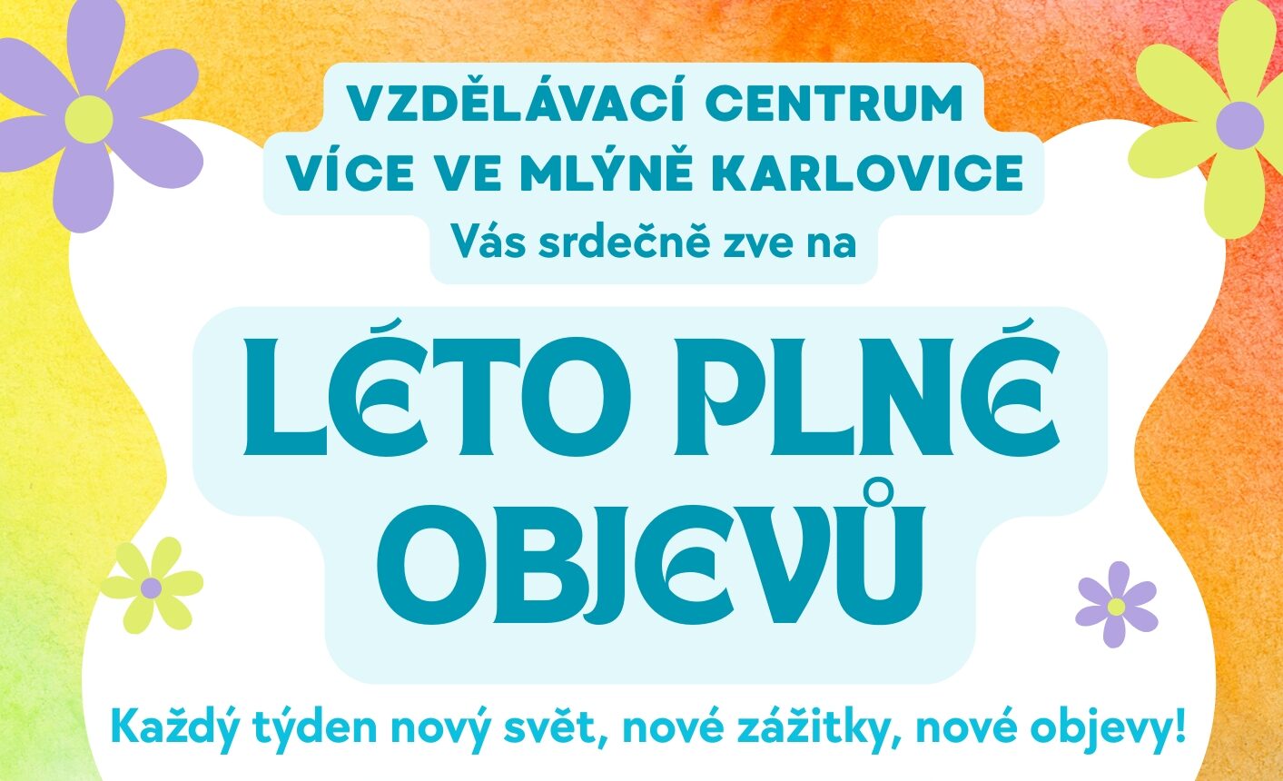 Ve VÍCE Ve mlýně Karlovice vás celé léto čeká devět tematických týdnů plných poznávání, tvoření a zábavy. Každý týden se ponoříme do jiného „světa“ – od ekologie přes plazy až po bylinky. Těšit se můžete na tvořivé dílničky, naučná stanoviště, hry, výstavu Jeseníky všemi smysly, občerstvení i pohodovou letní atmosféru.