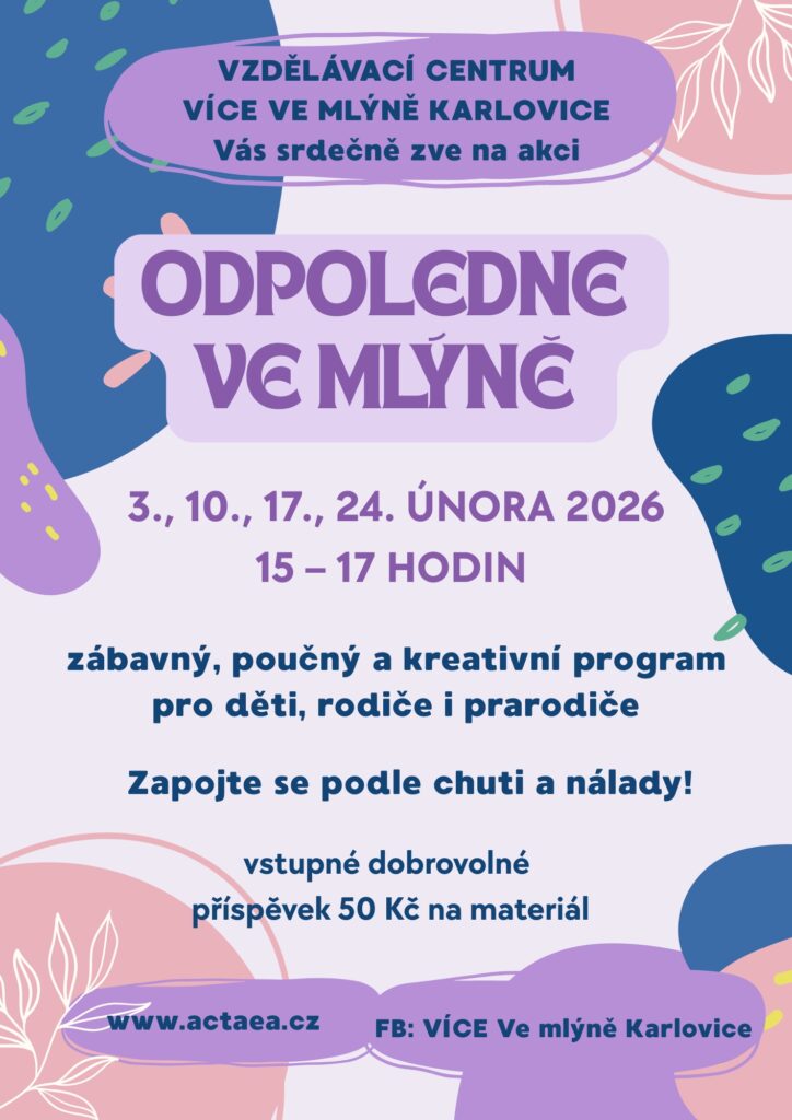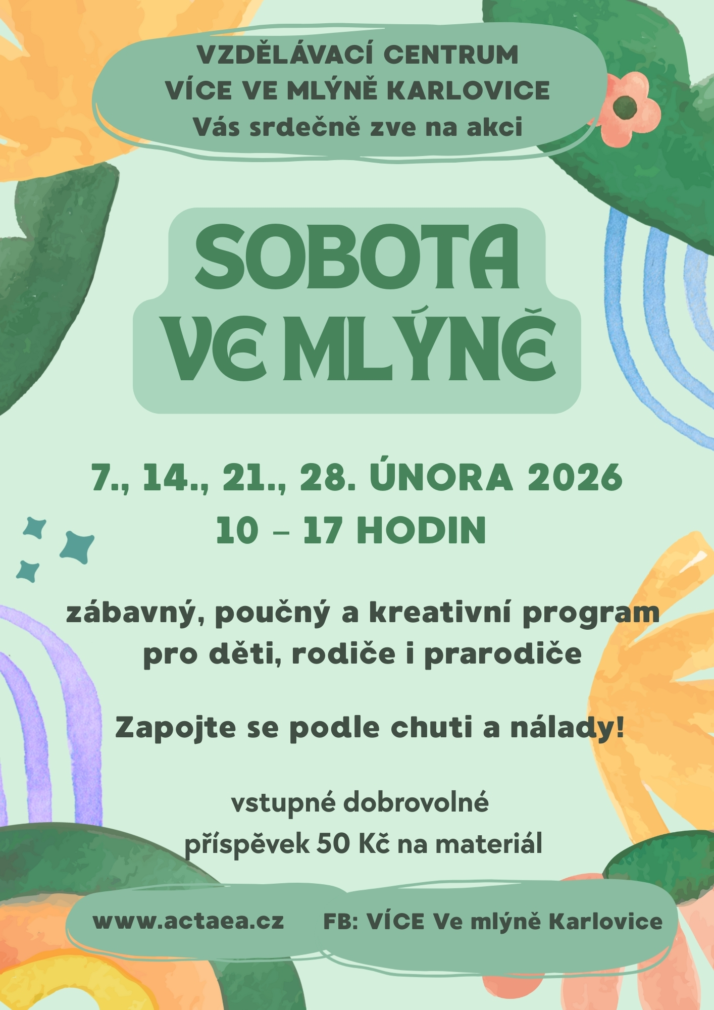 Od února bude centrum VÍCE Ve mlýně otevřeno každou sobotu všem, kdo si chtějí užít společný čas a zábavu. Od 10 do 17 hodin bude připraven zábavný, poučný a kreativní program, do kterého se můžete zapojit podle chuti a nálady.