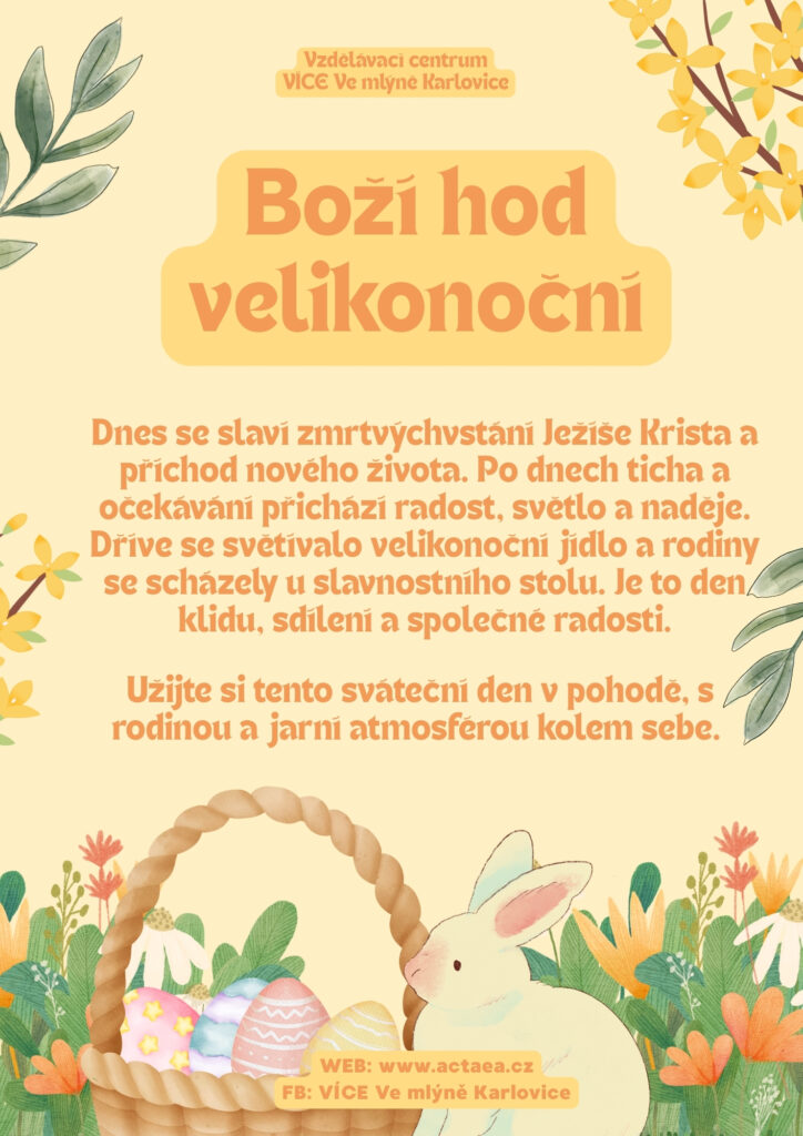 Přejeme vám krásný Boží hod velikonoční! Dnes slavíme nový začátek, radost a naději. Je to den, kdy se setkává rodina, sdílí se dobré jídlo a užívá se sváteční pohoda. Užijte si dnešní den v klidu, s úsměvem a jarní atmosférou kolem vás.
