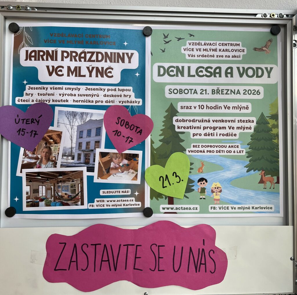 Pokud jste místní, nezapomeňte sledovat také naše nástěnky v okolí. Pravidelně je obměňujeme, aby vám žádná z našich akcí neutekla.