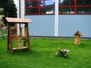 Proč hotel pro včely a obydlí pro čmeláky? Samotářské včely i čmeláci jsou zajímaví, ale málokdy je uvidíte. Když budou bydlet přímo vedle školy, budou se na ně děti moci podívat. Připravili jsme pro ně pěkné klátové úly a dřevěný „hotel“.