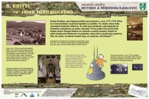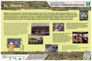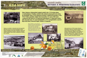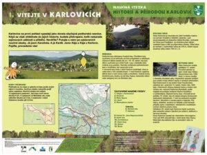Nová naučná stezka byla otevřena 22. května 2010. Provede vás okruhem dlouhým 8 km, který vede obcí a okolím s odbočkami na Mořské oko (2 km) a Adamov (3,5 km). Naučná stezka má 13 zastavení, 11 se nachází na okruhu, který vede obcí a okolím, jeden informační panel je umístěn u Mořského oka a jeden v Adamově. Dozvíte se o slavné historii a prosperitě Karlovic a přírodních zajímavostech a zvláštnostech v okolí. Na naučnou stezku navazuje několik dalších značených okruhů, které vás dovedou například na vyhlídku na Obří vrch, do Přírodní rezervace Karlovice-sever, na vyhlídku u Kamenné lávky, na Pocheňské louky, apod. Stezka byla připravována ve spolupráci s dětmi ZŠ Karlovice a širokou veřejností. Ke stezce byl vydán barevný průvodce, pohlednice a vyrobena trička prezentující obec Karlovice a naučnou stezku.