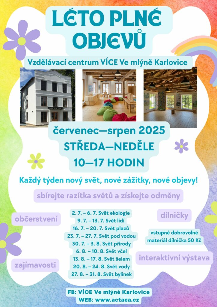Vzdělávací a informační centrum VÍCE Ve mlýně Karlovice se zaměřuje zejména na programy pro děti všeho věku. Naším cílem je předat návštěvníkům informace o přírodě a krajině a historickém vývoji Jeseníků a našeho regionu.