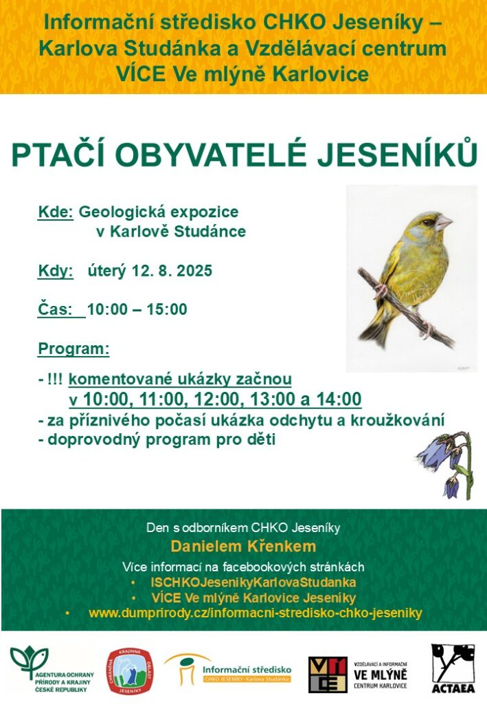 V úterý 12.8.2025 proběhne v IS CHKO Jeseníky v Karlově Studánce akce s názvem Ptačí obyvatelé Jeseníků. O ptactvu, které můžete v našich horách potkat bude povídat ornitolog Daniel Křenek, a to od 10 do 15 hodin.