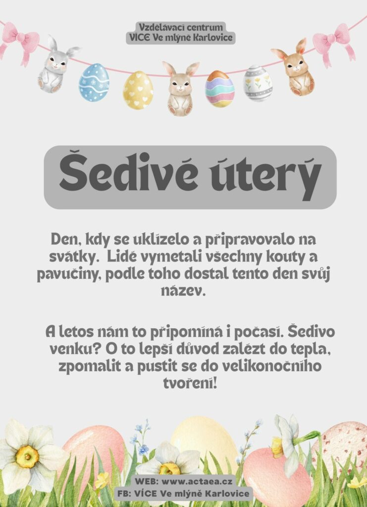 Přijďte si s námi užít týden plný tradic, tvoření a jarní radosti! Začínáme už dneska v 15 hodin a počasí venku dnes opravdu odpovídá tomuto dni velikonočního týdne – Šedivému úterý! Je to ale ideální čas zalézt do tepla a pustit se s námi do tvoření a objevování!