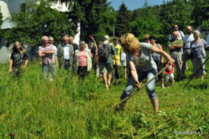 Přestože ranní rosa už dávno oschla a podmínky pro kosení kosou nebyl ideální, sešlo se na louce pod kostelem v Karlovicích 12 soutěžících a mnohem více diváků. Na pětimetrovou trať vysoké trávy nastoupili borci i borkyně s vervou. Po instruktáži provedeném porotou se pustili do boje.