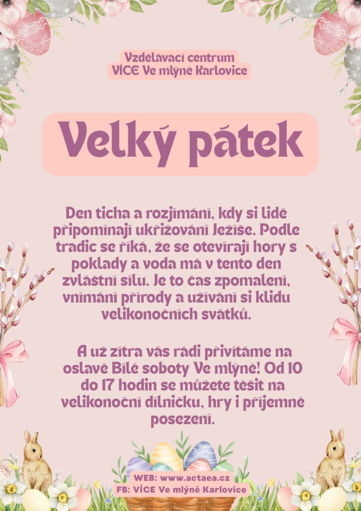 Dnes je Velký pátek – den ticha, příběhů a tradic. Říká se, že se otevírají hory s poklady a voda má zvláštní sílu. Je to ideální čas zpomalit, vyrazit ven a vnímat jarní přírodu kolem nás. Už zítra se na vás těšíme na Bílé sobotě Ve mlýně – od 10 do 17 hodin vás čeká velikonoční dílnička, hry i příjemné posezení.